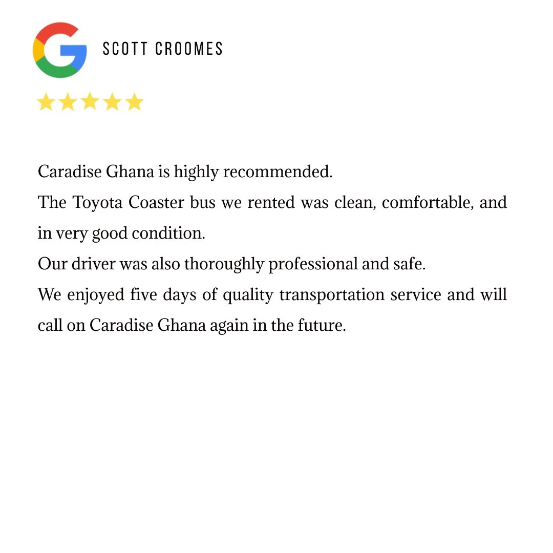 Our experienced drivers specialize in cross-country travel, ensuring you enjoy a safe, comfortable, and stress-free journey to any destination in Ghana. -