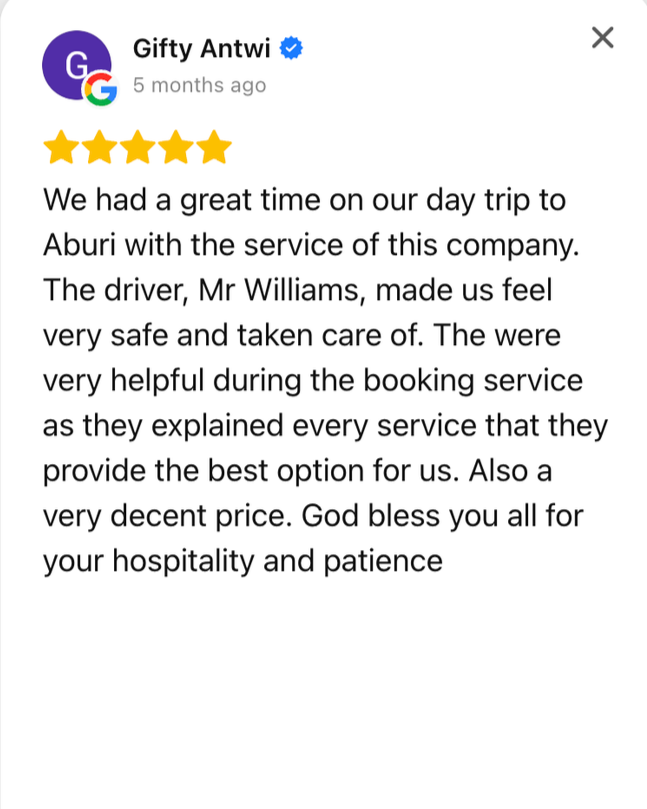 Our experienced drivers specialize in cross-country travel, ensuring you enjoy a safe, comfortable, and stress-free journey to any destination in Ghana.