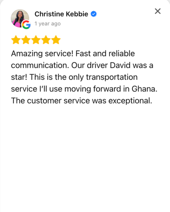 Our experienced drivers specialize in cross-country travel, ensuring you enjoy a safe, comfortable, and stress-free journey to any destination in Ghana.